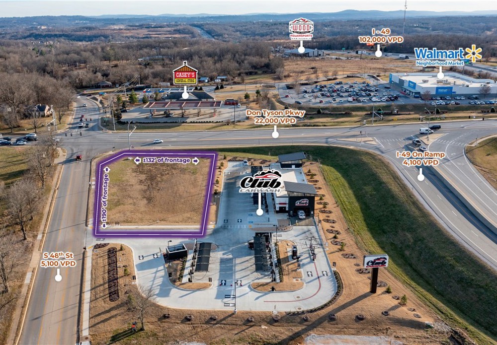 The property offers premier positioning adjacent to the I-49 on/off ramp, delivering immediate access and exceptional traffic exposure of approximately 102,000 vehicles per day. Situated on a corner lot with dual street frontage along S 48th Street and Don Tyson Parkway, the site benefits from superior visibility and access in all directions. The immediate trade area is anchored by a strong mix of national and regional brands, including Club Car Wash, Walmart Neighborhood Market, Casey’s, and Blue Cross Blue Shield. Strategically located at the southern gateway of the region’s “Care Corridor,” the site is supported by more than $200 million in active healthcare development and investment, further enhancing long-term demand drivers. Additionally, the property is in close proximity to multiple new multifamily residential developments and is fully serviced with all utilities on site, allowing for immediate development.